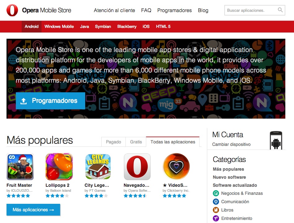 Hasta el navegador Opera tiene su propia tienda de aplicaciones para dispositivos móviles, entre otros Android, Java, Symbian, Windows Phone, iOS y BlackBerry, con algo más de 200.000 apps y juegos. Ofrece la posibilidad de descargar los archivos APK o bien instalar directamente la aplicación en tu dispositivo Android.