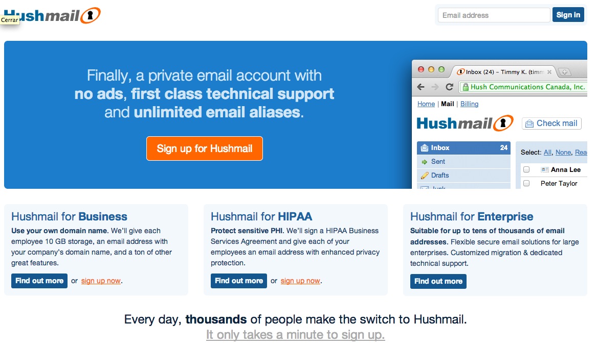 Si estás decidido a migrar a otro servicio, te propongo sustituir Gmail por Hushmail, un completo servicio de correo electrónico gratuito, sin publicidad y con cifrado PGP, conexión segura SSL y potente filtro anti-spam. Hacen especial hincapié en la contraseña que es en realidad una passphrase, o sea una contraseña un poco más larga para que sea más segura. Sólo tiene un inconveniente, si la pierdes no hay forma de recuperarla, y por ende ya no podrás acceder a tu cuenta, ni los empleados de Hushmail podrán serte de ayuda alguna. La única pega es que la cuenta básica gratuita está limitada a 25MB y sólo se puede usar vía web. Obviamente puedes ampliarlo a un plan de pago. Descubre Hushmail.