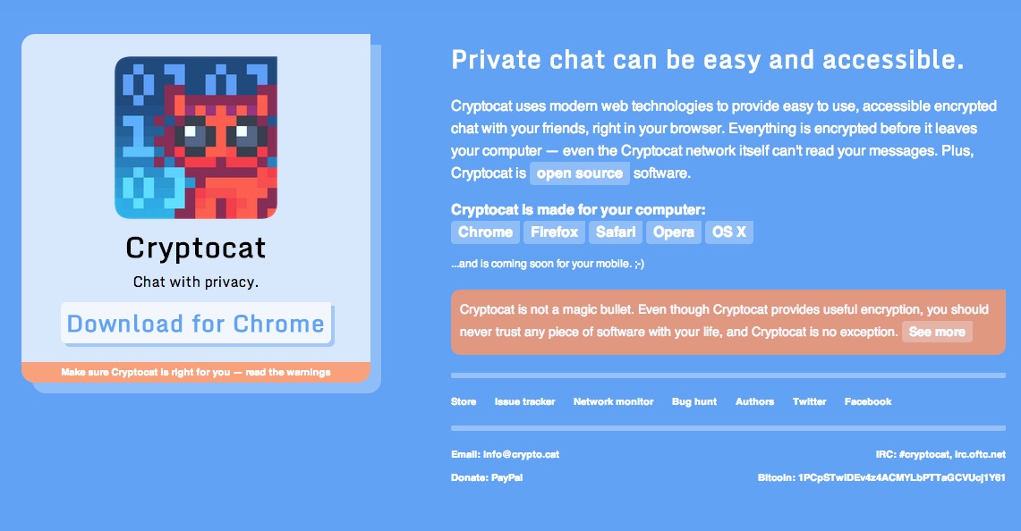 Si quieres evitar que se rastree tu IP deberías usar Tor como complemento. Está claro que CryptoCat no es un rival real para Google Talk, Skype o Whatsapp pero es una alternativa que gana adeptos cada día, pues ya cuenta con una buena cantidad de usuarios. Si te preocupa tu privacidad y quieres mantener tus mensajes privados, lejos de las miradas indiscretas, no lo dudes.