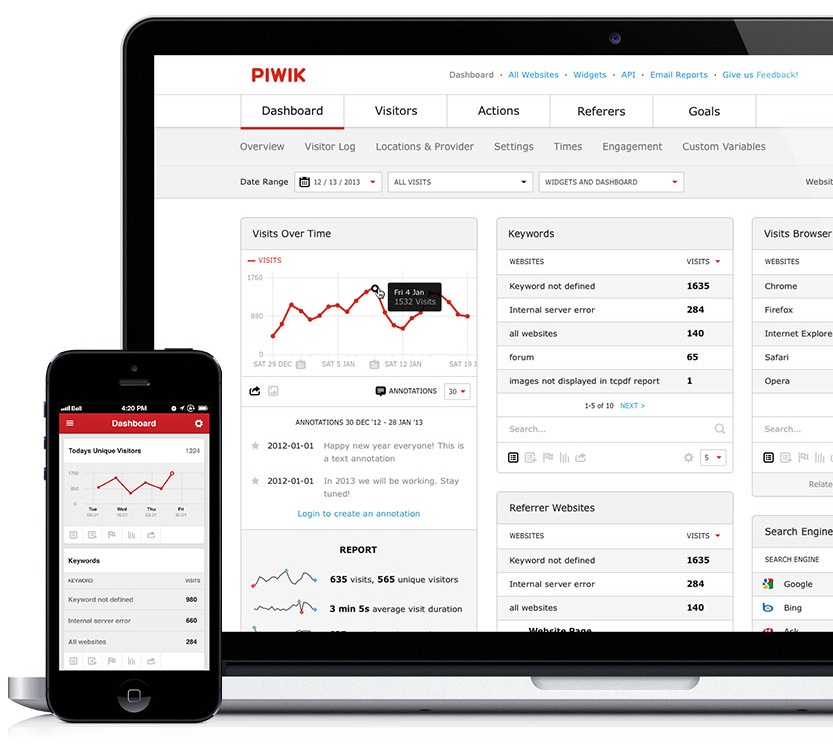 Pero hay más, la posibilidad de rastrear las descargas, los enlaces salientes -en Google Analytics hay que etiquetarlos manualmente-, incluso obtener estadísticas de abandono de los carritos de la compra. Por lo demás ofrece herramientas muy similares para conocer el comportamiento de los usuarios en tu página web, de dónde vienen, adónde van, cuáles son las páginas más populares, con qué frecuencia tus visitas son recurrentes, hacer el seguimiento de campañas de marketing, y lo más importante, aunque sólo sea en el caso de Piwik… el control total de tus datos -no es así en Google Analytics que ofrece muestreo en los informes. En Piwik tienes acceso a datos de seguimiento brutos más amplios gracias a las API; incluso se pueden exportar en una amplia variedad de formatos. Por último, su aplicación móvil es una pasada y puedes personalizar el código de rastreo js para modificar o ignorar ciertos elementos; su comunidad muy activa ofrece complementos.