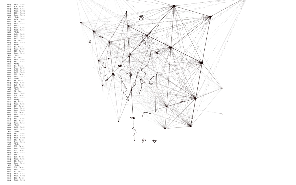 El artista explica que esta instalación de software art recrea un universo compuesto por redes de cuerdas o filamentos vibrantes. El término Máquina virtual, en informática, hace alusión a un programa que simula el funcionamiento de un ordenador físico, aunque no se haya construido. Vacuum Virtual Machine muestra su mecanismo interno: una red que se automapea con la estructura interna del programa, el resultado es una operación no lineal y emergente. Se basa en la existencia de un código rizomático que configura la estructura de esa red, que se entiende a través de procesos abstractos, y paralelamente permite explorar distintas áreas de conocimiento.