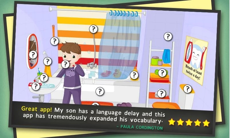 Asimilarán palabras de la vida cotidiana jugando. Los personajes les enseñarán palabras, las podrán leer y escuchar hasta asimilarlas. Mediante las imágenes serán capaces de identificar objetos y localizarlos en las escenas: dormitorio, parque, cocina, cuarto de baño. La música es dinámica, hay aplausos y se usa mucho el refuerzo positivo. Tus hijos mejorarán su fluidez en inglés y podrás trasladar el juego a la vida real con facilidad.