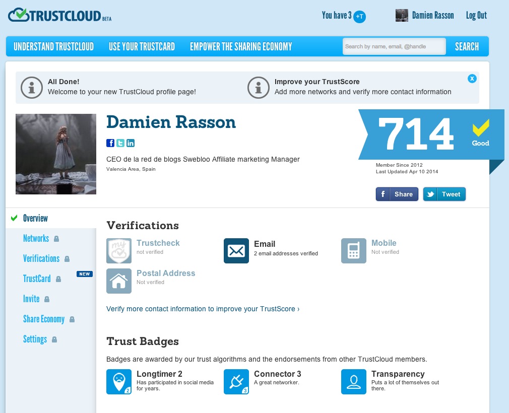 La economía es el reflejo de la sociedad, de cómo somos y cómo actuamos, del porqué tomamos tal o cual decisión. Siempre existirán los aprovechados pero a diferencia de la economía tradicional, aquí te quedas fuera si abusas. Ya existen múltiples sistemas para verificar la fiabilidad, credibilidad y honestidad de cada usuario, algunas plataformas lo llaman karma o social score. Incluso existen algo más valioso que el DNI, una tarjeta digital que calibra tu nivel de integridad usando como fuente tu actividad en las redes sociales y plataformas de economía compartida. Si no disfrutas de una identidad digital con buena salud, no obtendrás mucha puntuación; el servicio TrustCloud ofrece la tarjeta TrustCard. La confianza sustituye a la codicia en esa economía.