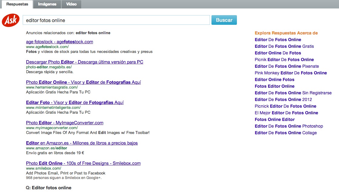También arroja todas las preguntas similares o los temas que estén relacionados con las palabras claves que hayas introducido. No suelo usarlo, y tampoco trae buena prensa, su recorrido por España ha sido algo tumultuoso. Muchos se quejan de la barra de Ask que se instala en el navegador, a menudo sin ser muy consciente de ello. En definitiva, si tienes una duda, pregúntale al buscador Ask.com de forma sencilla y rápida.