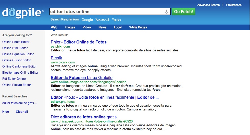 Dogpile lanza las consultas usando tres de los buscadores web más importantes, a saber Google, Yahoo y Yandex. Imágenes, vídeos, noticias, lo típico. No hay que olvidar que Dogpile es un veterano en esto, con años de batalla a sus espaldas. Entra en la categoría de los metabuscadores y está entre los buscadores más usados del mundo.