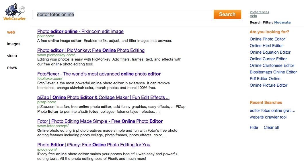 Webcrawler es otro de los dinosaurios de la primera era de Internet, un metabuscador que ha sobrevivido a los años pero no ha evolucionado mucho por desgracia. Para las búsquedas, combina varios motores como Google o Yahoo, con opciones para la búsqueda de imágenes, vídeos, música o noticias; algo bastante común.