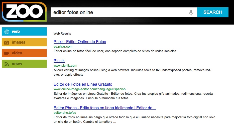 Zoo es el resultado del lavado de cara de metacrawler, ahora conocido como Zoo. Una vez hayas escrito tu consulta puedes escoger entre una búsqueda en web, imágenes, vídeos o actualidad. Los resultados provienen de Google y Yahoo para la web, Yahoo para las imágenes, Yahoo y Truveo para los vídeos y Yahoo para las noticias.