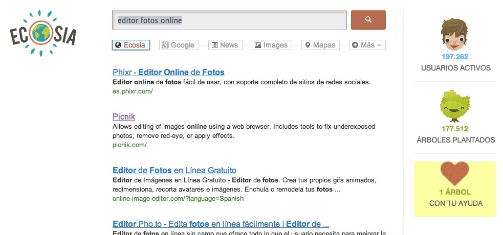 Ecosia es un proyecto interesante ya que comparten los ingresos generados por tus consultas donando el 80% a un proyecto de plantación de árboles en Brasil. Usan la tecnología de Yahoo y Nimg que no tienen en marcha políticas medioambientales al contrario de Google. De hecho, si lo deseas puedes usar el motor de búsqueda de Google también quien trata de cubrir el gasto energético que genera mediante energía renovable.