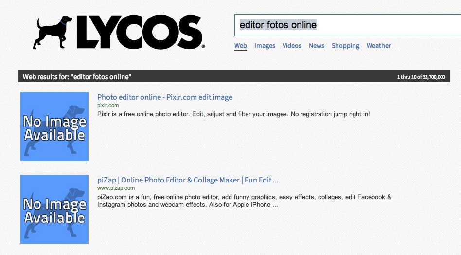 De hecho, si tratas de lanzar unas cuantas consultas… tendrás mucha suerte si te devuelve resultados en español. Por otro lado, lo de poner la imagen del perrito con la frase de “no image available” tiene tanto impacto visual en las páginas de resultados que hasta distrae y acaba por desquiciar. Lo tenemos en esta lista por respecto a lo que fue… un día.