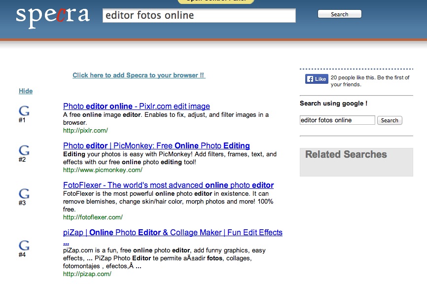 Seguro que nunca has oído hablar de Specra, al igual que casi todos los motores de búsqueda en la cola de esta lista. Aún así, sigue mereciendo su presencia en nuestro listado. Usa tres motores de búsqueda más populares, a saber Google, Yahoo y Bing, pero añade su granito de arena filtrando los resultados y ordenándolos en base a un pequeño algoritmo.