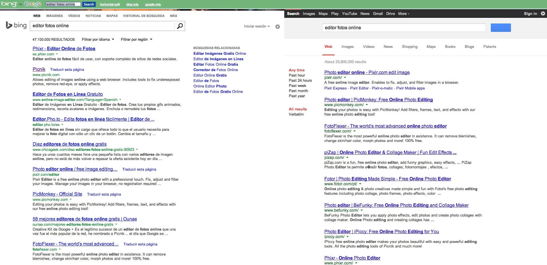 Puedes ver los resultados horizontal o verticalmente si lo prefieres, o acceder sólo a los resultados de uno de los dos buscadores. Resulta interesante ver los resultados de ambos buscadores cara a cara, aunque obtendrás mejores resultados cambiando las preferencias del idioma en cada uno de ellos, o logeando, por ejemplo. También dispone de la extensión para ejecutarse directamente desde IE o bien el navegador Firefox.
