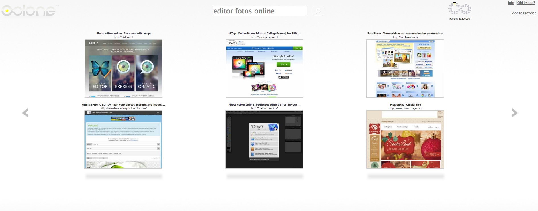 Oolone es un buscador visual, más bien de adorno porque si bien resulta interesante a la primera, no lo es a la hora de encontrar información realmente útil. Muestra el símbolo del infinito en pantalla y cuando te devuelve los resultados, verás capturas de pantalla de las páginas pero ninguna descripción útil y con los títulos truncados. Luego puedes navegar de un lugar a otro del símbolo del infinito usando las flechas pero parece aleatorio.