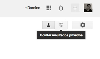Y no siempre es así. A los resultados orgánicos irán mezclándose recomendaciones de los amigos de nuestra red de contactos Google plus. Por suerte, se puede optar por desactivar estos resultados sociales haciendo clic en el pequeño botón del globo terráqueo. De este modo se ocultarán las sugerencias de tus amigos de forma temporal. Sí, sólo es válido para la sesión abierta. Si quieres que sea permanente has de ir al botón de la rueda dentada, configuración de búsqueda y en la sección de resultados privados marcar “no usar resultados privados”.