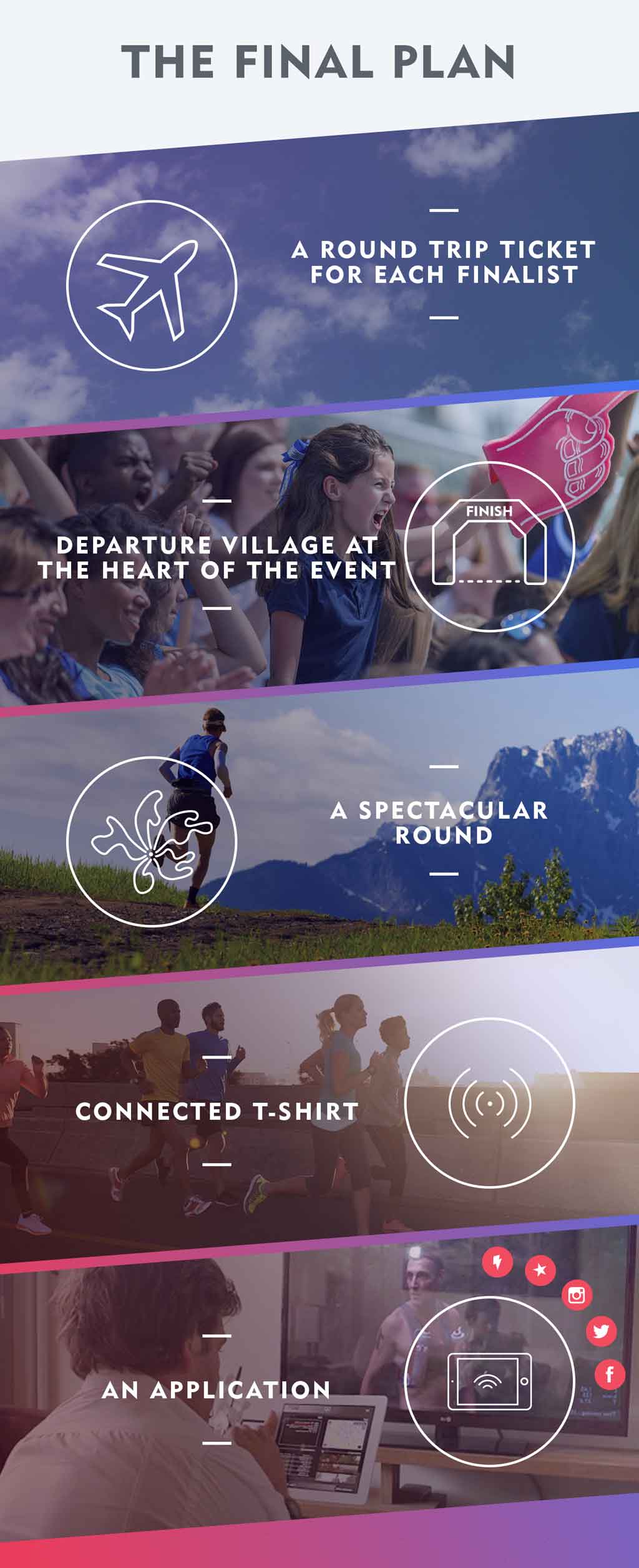 No olvidemos al sistema de gamificación con las recompensas y bagdes que los participantes reciben al cumplir nuevos objetivos: el badge del mejor corredor en el equipo o el badge del corredor más constante, el más veloz,… La competición empezará en mayo hasta el 18 de septiembre, luego se seleccionará a los 50 mejores equipos para participar a una carrera de relevos que durará 24 horas con 12 puntos de control que servirán a la eliminación de varios equipos. Al final de la carrera, sólo quedará un equipo vencedor de la carrera final.