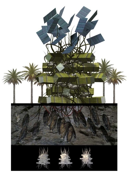 Por ejemplo, su proyecto Arizona Tower, creado con Xfrog, fue modelado a partir de plantas vivas. El edificio está anclado al terreno por raíces, luego se desarrolla con una morfología ramificada. Las raíces, en sus extremos bajo tierra, permiten almacenar agua, y las ramas, en la altura, presentan paneles solares. Una serie de vainas, conectadas con una doble escalera en espiral, permite el acceso y la circulación. Luego se alza una segunda serie de vainas que delimita cada espacio doméstico. Según explica el artista, se trata de un experimento que abre las puertas hacia las tipologías biorelacionadas. Arizona… alinea formas lógicas formas botánicas. Reinterpreta y desarrolla mediante sistemas computarizados materiales naturales, no tóxicos y biomiméticos.