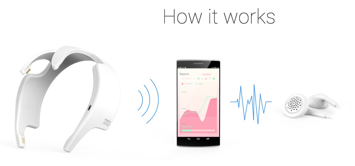 La terapia musical funciona y es la piedra angular del objeto conectado llamado Melomind, un casco y sus cuatro electrodos. Una vez colocado en la cabeza, sus electrodos recogen las ondas cerebrales como si de un electroencefalograma se tratase. Las mide y transmite los datos a la app en el smartphone que analiza en tiempo real tu nivel de estrés.