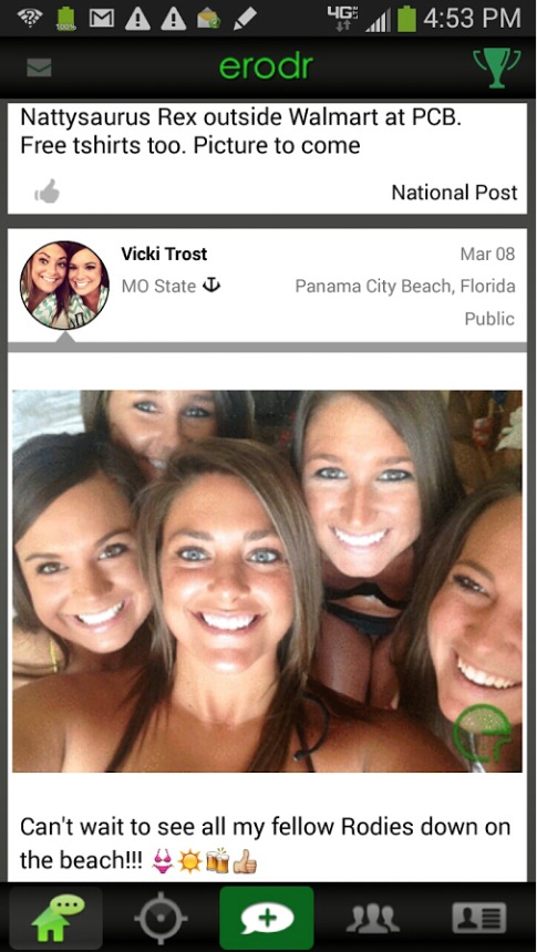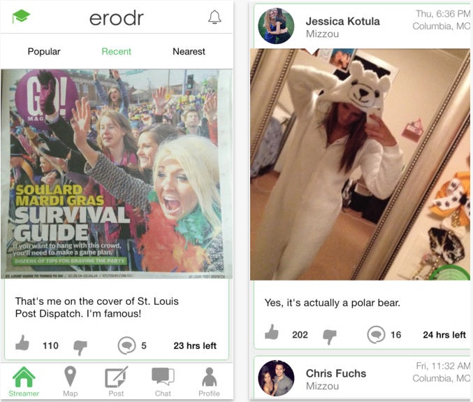 Si echas en falta lo que era Facebook en sus inicios, cuando tu madre y colegas del trabajo no lo usaban y podías soltarte la melena, ése es Erodr. Puedes publicar fotos, mensajes y comentarios de forma anónima o en tu círculo de contactos geolocalizados en el campus universitario. Eres libre. Si lo haces de incógnito lo que publicas estará al alcance de los estudiantes que se encuentran a los alrededores.
