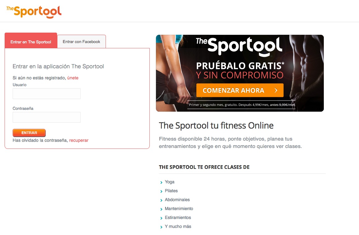 Si realmente no tienes tiempo de ir al gimnasio o simplemente te dan algo de claustrofobia sin hablar del olor a sudor que lo impregna todo, tienes a Sportool. Se trata del primer centro de fitness online abierto las 24h del día, 7 días a la semana todo el año. No sólo ofrecen clases en formato vídeo sino también una completa red social relacionarte con personas que tienen tus mismos objetivos, valorar los monitores y mandar mensajes. Fija tu objetivo, planea tus entrenamientos y apúntate a clases de yoga, abdominales o pilates y demás. Si no tienes tiempo de desplazarte y quieres tener la libertad de hacer deporte cuando puedas desde casa, es una buena opción.