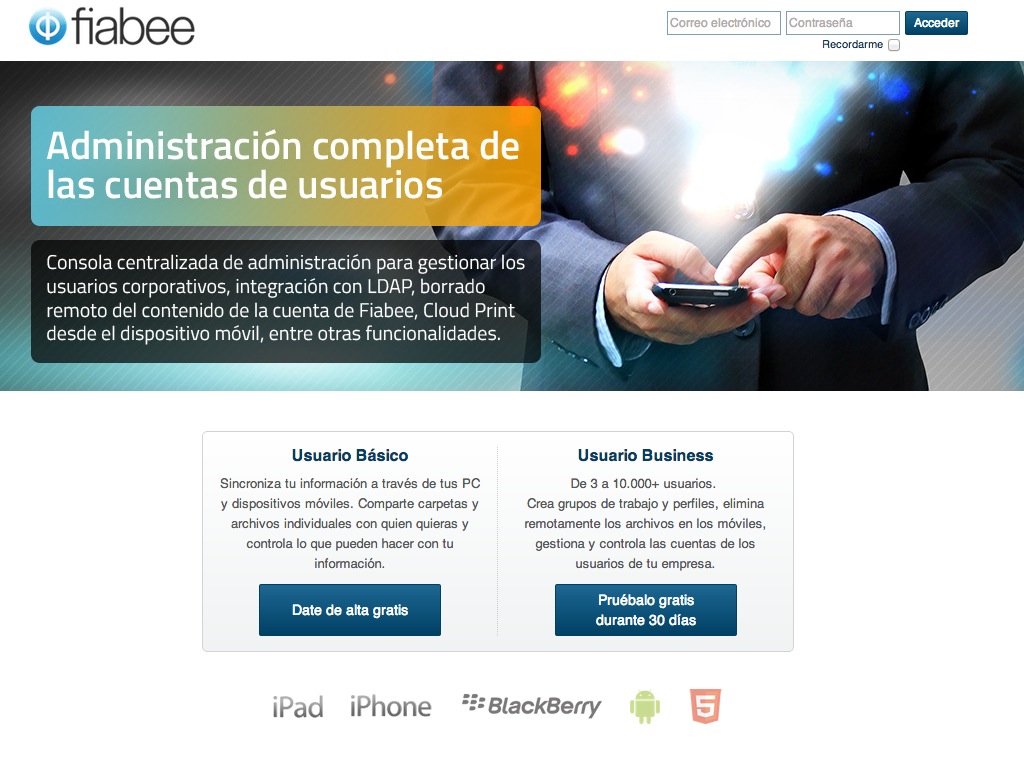 Fiabee luce una interfaz muy limpia, se ha currado su imagen y sabe vender muy bien su servicio. Ha sido especialmente pensado para empresas ya que ofrece un servicio de sincronización que permite la colaboración de entre 3 y 10.000 usuarios en varios grupos de trabajo, cada uno con su perfil definido y posibilidad de actuar directamente sobre los archivos, como el eliminado remoto de archivos desde el móvil o la gestión y control de todas las cuentas de los usuarios de la empresa. Ofrece su propia API abierta que permite a las empresas desarrollar su propia estrategia móvil interna y externa. Permite aumentar de inmediato la productividad de los empleados y colaboradores externos de una empresa ya que además de flexible es escalable.
