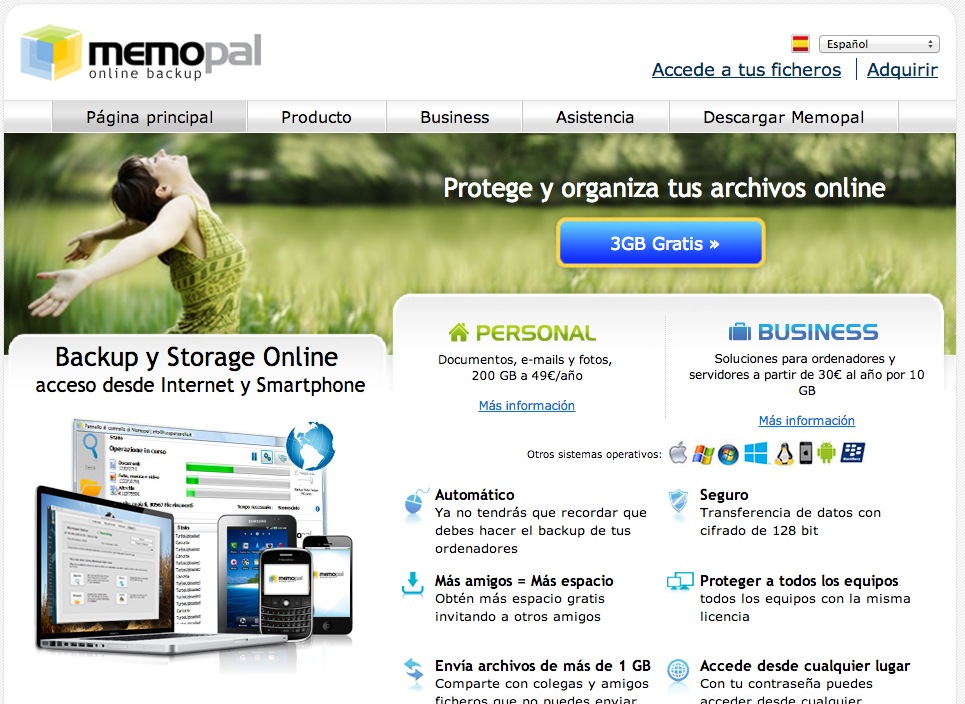 Ofrece 3Gb de espacio gratis online para hacer tus copias de seguridad. Si necesitas más espacio, hay una formula de 200GB por 49€ al año. Disponible para Mac e iPhone, Windows y Linux, hasta a través de su interfaz web (incluso desde móviles con navegador web).Subir tus ficheros a la nube será pan comido. Si invitas a más amigos, tendrás más espacio gratis y, como ventaja, se puede compartir con colegas y amigos ficheros de hasta 1GB. Usa cifrado de 448 bits y limita a diez ordenadores su uso con la licencia personal. Lo interesante de Memopal es la tecnología propia que tienen, llamada MGFS.