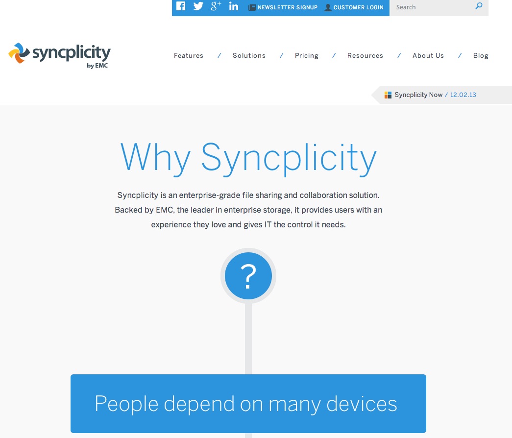 Ofrece 2GB de espacio gratis online pero limitado a un solo usuario y dos ordenadores como mucho. Si necesitas sincronizar datos entre más de dos equipos, tendrás que actualizarte al plan 15$ al mes con un máximo de 5 dispositivos o Business con un número ilimitado, ambos con 50GB de espacio.Ofrece tanto el respaldo de datos online como la sincronización entre dos o más equipos.Igual que DropBox, permite compartir datos con amigos sin que sean usaurios de Syncplicity. Lo único que necesitan es un enlace que compartes vía el correo electrónico. Lo interesante es que nos permite sincronizar datos con servicios online como Facebook o Google Docs