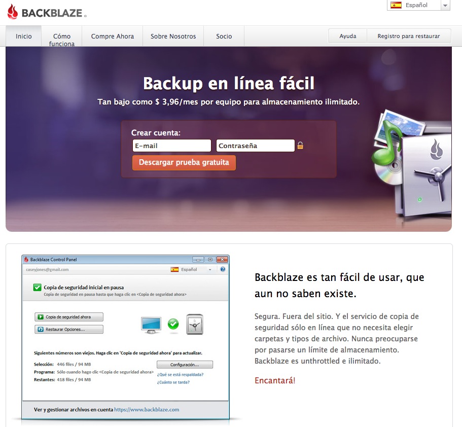 Es una solución de pago pero por tan sólo 3,96€ al mes tendrás un espacio de almacenamiento en la nube ilimitado. Disponible tanto para Mac como Windows, su interfaz es muy similar a la de otros servicios idénticos.La sencillez es la clave de BackBlaze, todo ha sido pensado para dejar al usuario feliz. En unos pocos clics lo tendrás todo online ya que puede escanear tu equipo en busca de ficheros multimedia para subirlos online.Es bastante rápido y si lo deseas, te pueden hacer un respaldo en DVD o llave USB que recibirá a través de FedEx. Se pueden programas las copias de seguridad y programarlas para cuando el equipo esté inactivo.