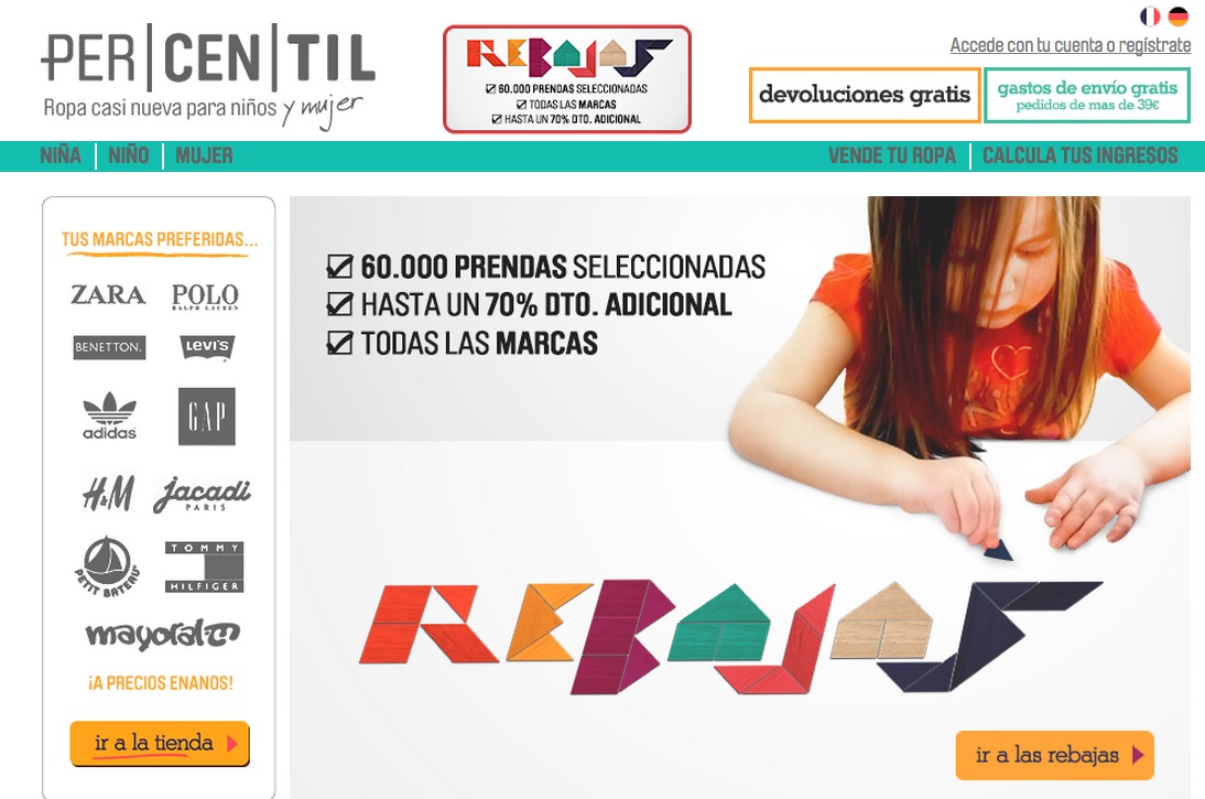 Percentil es una tienda de ropa de segunda mano para niños y mujeres en la que pagan por adelantado, es decir que no se asemeja a un tablón de anuncio ni has de dejar tu ropa en depósito y esperar a ver si con suerte se vende. Garantizan un pago mínimo que varía entre el 20 y el 60% del precio de venta nuevo en tienda. Tiene sus pros y sus contras ya que por un lado no tratas directamente con una comunidad y por ende el inventario es menor, pero por otro lado te aseguras de la calidad ya que ya han pasado por un proceso de selección manual. Es una forma de reciclar fácil y rápidamente la ropa de tus niños que no paran de crecer y crecer.
