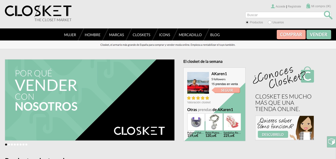 ClosKet es otra comunidad de particulares, muy similar a Chicfy, que deciden poner a la venta online la ropa a la que ya no dan uso y de paso renovar su armario usando la fuerza de las herramientas sociales diseñadas por el talentoso equipo detrás de este proyecto. Y como toda comunidad que se precie, existen perfiles de usuarios donde podemos buscar gangas en sus armarios virtuales, ver las valoraciones que se ha ganado a través de sus transacciones, sus followers o a quienes sigue, etc. Ofrecen muchos filtros entre los que destaca el estado de la prenda: poco usado, buenas condiciones, tiene desperfectos o nunca usado. Sin duda, …a place to be.