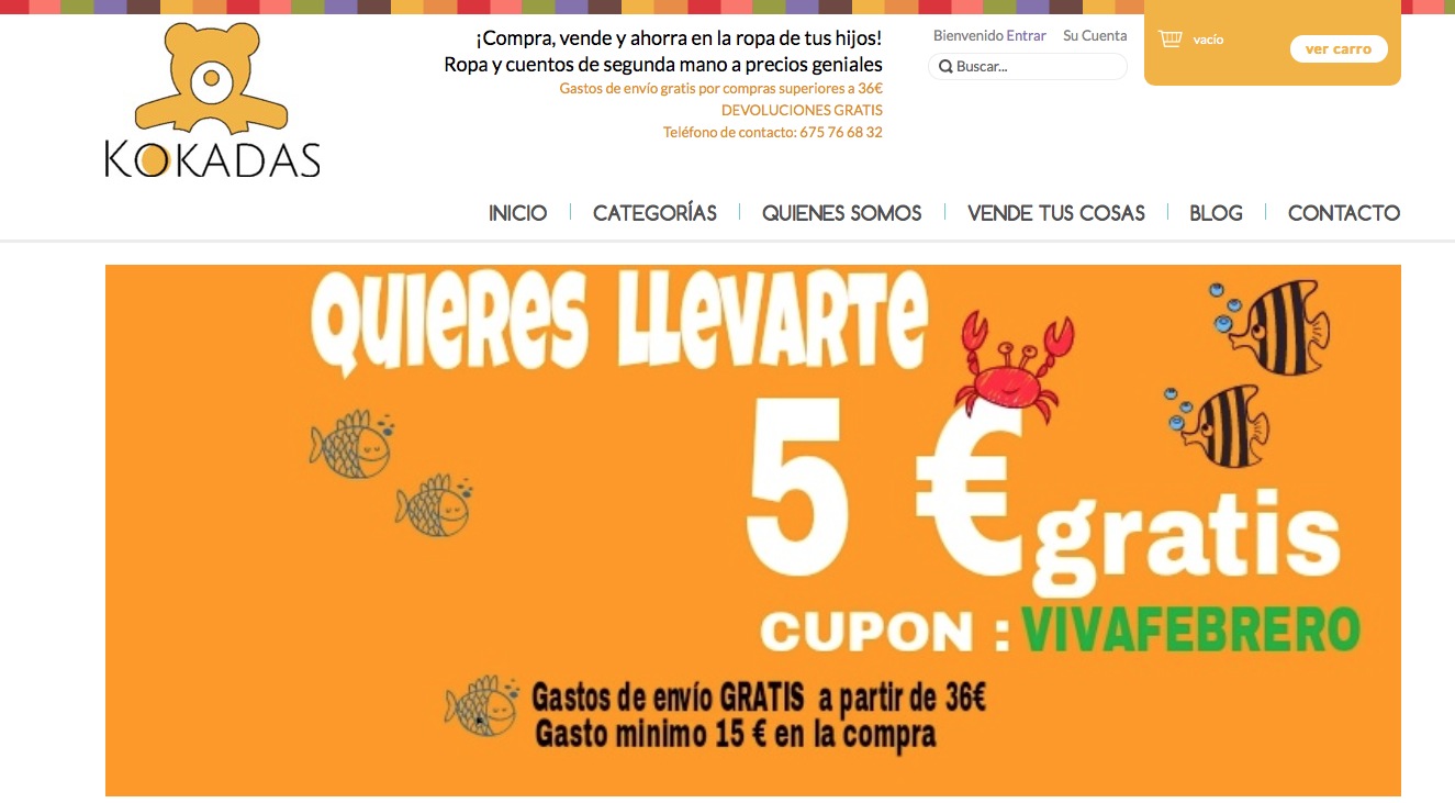 Kokadas es una tienda de ropa de segunda mano para niños de 0 a 12 años, pero no sólo ropa sino que se puede reciclar también los cuentos que tus hijos conservan desde bien pequeños para que los sigan disfrutando otros niños. Siendo padre, sé lo difícil que es conservar un cuento, hacer que lo disfruten tus hijos sin que rasgue páginas y acabe coloreándolo. Si por milagro logra superar esta prueba, puedes usar Kokadas para venderlos. En el momento de escribir esta entrada su proceso de recogida de ropa está cerrada por lo que desconocemos las condiciones, si compran la ropa o si está en deposito hasta que se produzca la venta.
