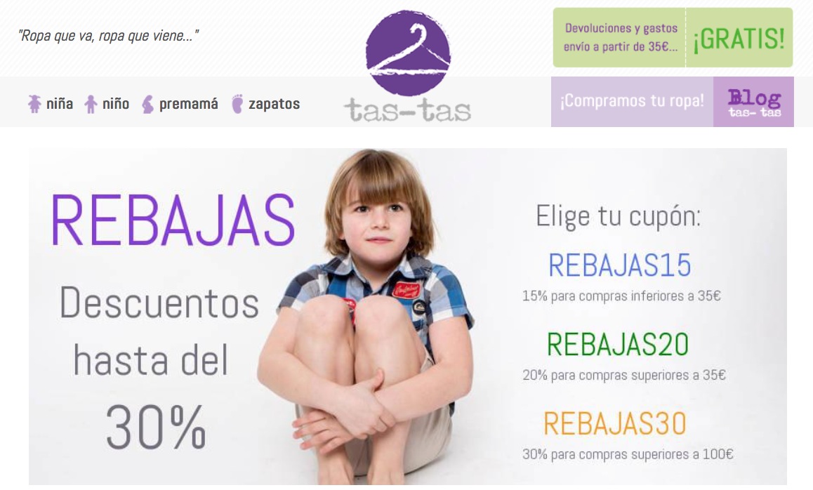Tastas es similar a Percentil y Quiquilo ya que se centra en la ropa para bebés y niños, con un proceso de compra similar en el que pagan por adelantado a los particulares que desean vender la ropa que ya no usan sus hijos. Pagan entre el 20% y 40% del precio al que venderán tu ropa en su tienda; por ahora el proceso de envío de bolsas está suspendido igual que en Kokadas. Tienen bastante ropa y tal vez ese sea el motivo de que por ahora no aceptan más ropa, teniendo en cuenta que la compra de ropa de segunda mano en España no está muy extendido todavía. Tienen una sección de zapatería para niños y un listado con muchas marcas.
