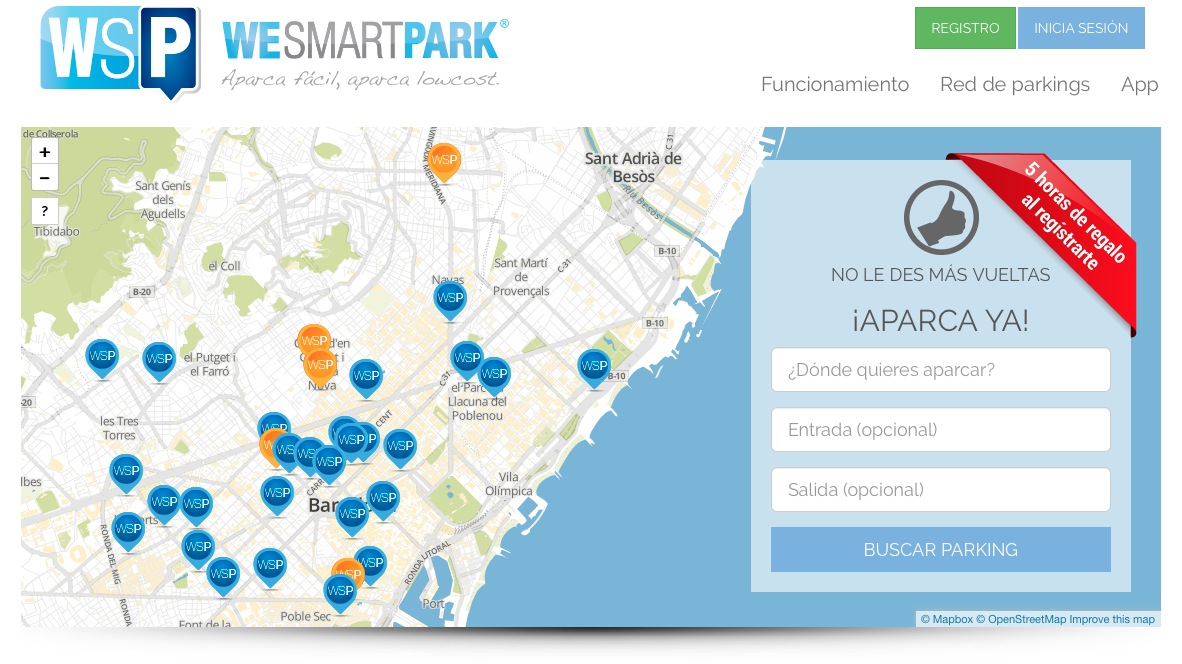 WeSmartPark es una red de aparcamientos en expansión ya que por ahora sólo está disponible para las ciudades de Madrid y Barcelona, mayoritariamente. En la ciudad condal por ejemplo, cuenta ya con más de 30 parkings disponibles 24h al día y a precios muy económicos ya que la promesa de WSP es que te puedes llevar un ahorro de hasta el 60% sobre tarifas convencionales. El sistema de reserva se puede hacer a través de su interfaz web o bien usando su app: indicas la hora de entrada y salida y al acercarte a la barrera detectará el adhesivo teletac además de indicarte tu plaza -al registrarse te enviará una pegatina que hay que colocar en el parabrisas del coche-.